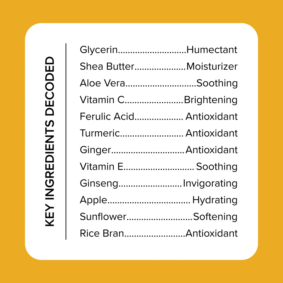 Illuminez votre peau avec notre Crème Corps Vitamine C + Curcuma, une formule légère et onctueuse conçue pour illuminer et unifier le teint. Infusée de deux formes de vitamine C et d'extrait de curcuma, elle aide à réduire l'apparence des taches brunes, à améliorer la clarté et à rehausser l'éclat du teint. Cette crème nourrissante laisse votre peau hydratée, douce et éclatante.