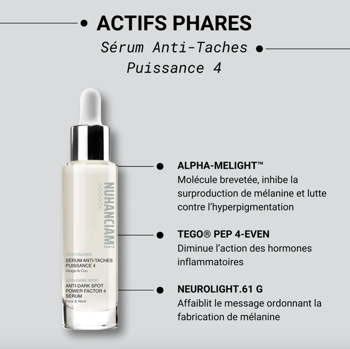Le Sérum Anti-Taches Puissance 4, pour le visage, le cou et le décolleté, agit sur tous les désordres pigmentaires : taches de vieillesse, hyperpigmentation, irrégularités du teint et masque de grossesse. Prévient la formation des taches. Texture fine et fondante, agréablement parfumée