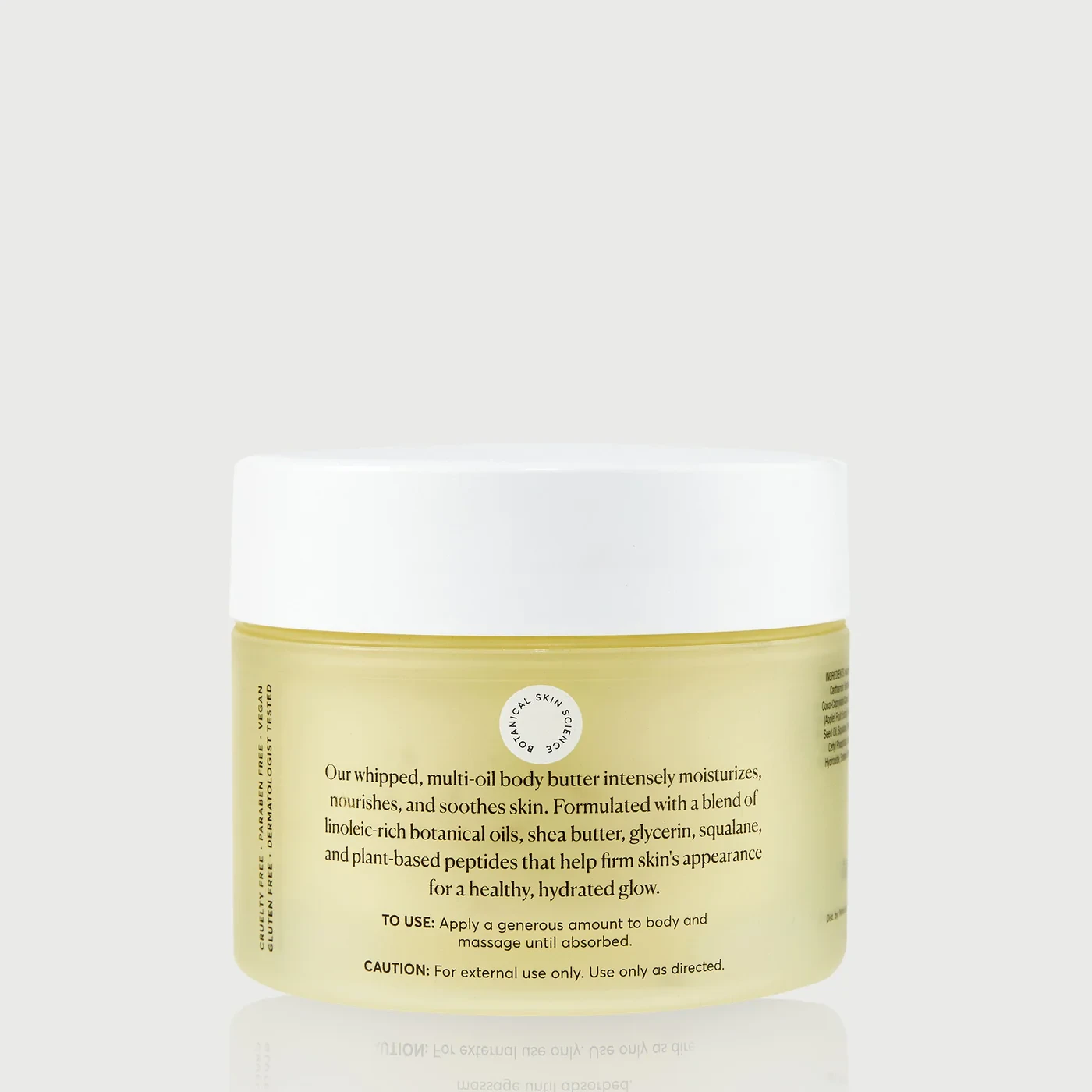 Cette formule riche combine des huiles botaniques riches en linoléique, du beurre de karité profondément hydratant et du squalane pour fixer l'hydratation. Les peptides d'origine végétale renforcent la fermeté de la peau, la laissant lisse et souple. Découvrez les effets apaisants de la glycérine et l'arôme calmant de la vanille et de la noix de coco.