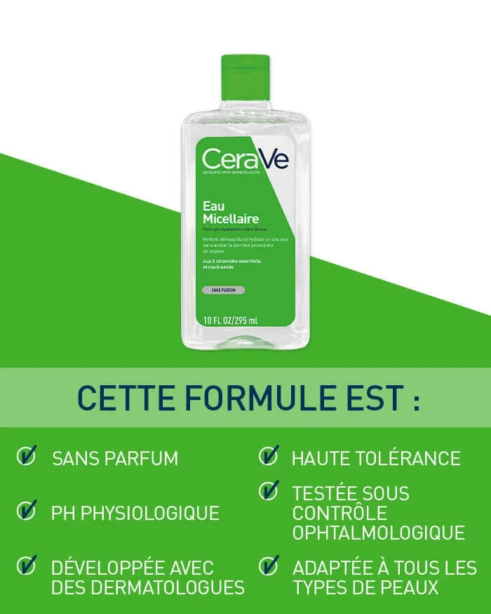 L'Eau Micellaire de CeraVe est un produit 3-en-1 qui nettoie, démaquille et hydrate les peaux normales à sèches, sans altérer la barrière cutanée. Elle nettoie la peau en douceur et élimine les impuretés, la pollution et le maquillage du visage, des yeux et du cou.