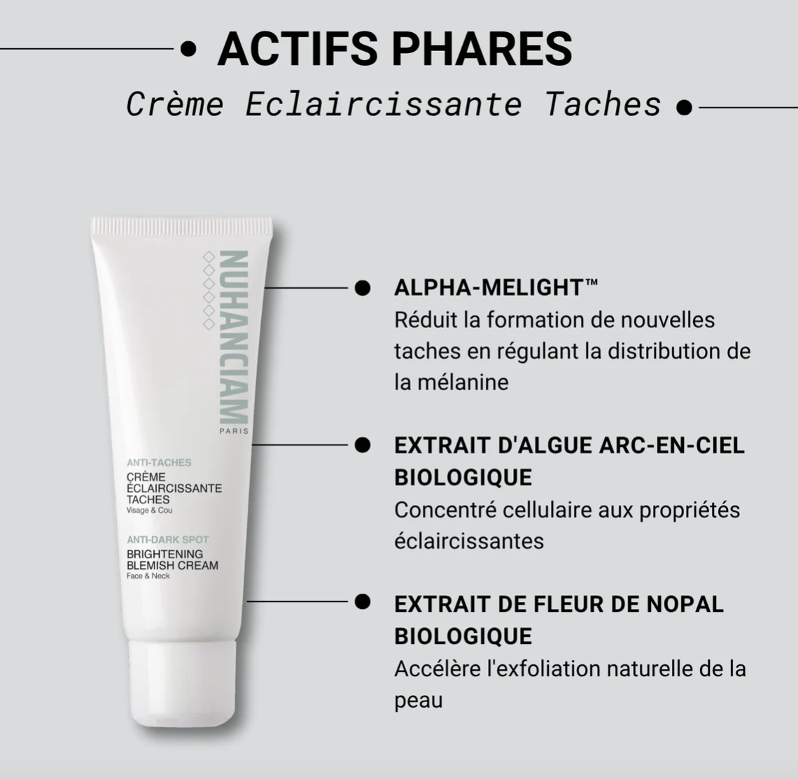 La Crème Éclaircissante Taches pour le visage et le cou agit sur tous les types de taches pigmentaires brunes (irritation, soleil, vieillissement). Spécialement conçue pour répondre aux besoins des peaux noires à mates, elle est tout autant adaptée aux peaux plus claires. Les meilleurs ingrédients ont été sélectionnés pour leur capacité à cibler et traiter l'hyperpigmentation tout en respectant l'équilibre naturel de la peau. Formulée à partir d'actifs d’origine naturelle, cette crème anti-taches offre une action éclaircissante douce et prolongée et se distingue par sa formulation innovante, alliant science et naturalité.