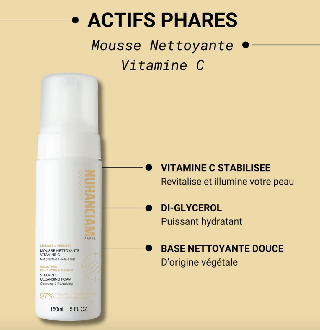 La Mousse Nettoyante Vitamine C, pour le visage et le cou, agit comme un véritable booster d'éclat grâce à son dérivé de vitamine C stabilisé qui revitalise et illumine votre peau dès le rinçage. Sa formule enrichie en diglycérol, puissant actif hydratant, associé à une base nettoyante douce d'origine végétale, élimine efficacement les impuretés tout en laissant la peau parfaitement confortable. Texture légère et onctueuse, elle se transforme en mousse délicate au contact de l'eau pour une expérience sensorielle agréable. La peau est nette, éclatante et hydratée après chaque utilisation.
