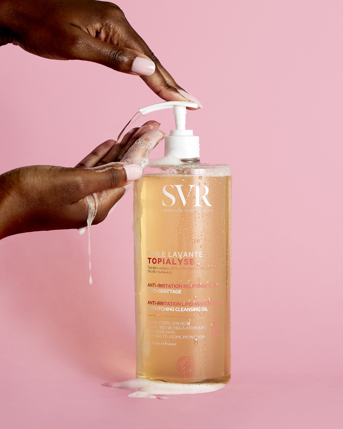 L'Huile Lavante Anti-Irritation Relipidante Topialyse des laboratoires SVR est un soin lavant pour toute la famille qui peut être utilisé en gel douche, pour un bain moussant, comme shampoing, démaquillant et même l'hygiène intime. En texture huile pour une expérience sensorielle agréable, sa formule est riche en actifs relipidants et hydratants, au parfum délicat et réconfortant.